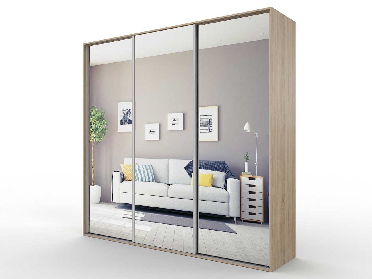 В базовую комплектацию шкафа входит кромка 0.4 мм, ручки торцевые, ламинированное ДСП 16 мм, ламинированное ДВП, направляющие Версаль, ходовые ролики РКМ-70, зеркала
